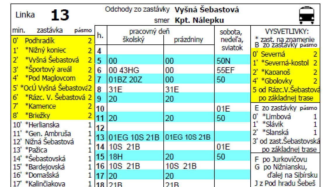 Cestovný poriadok MHD linky č. 13 od 1.1.2024