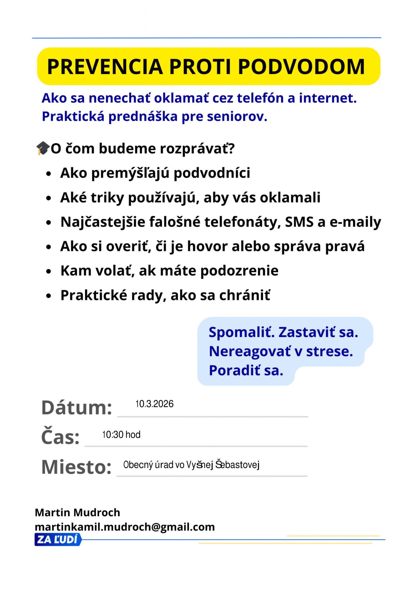 Pozývame Vás na prednášku s názvom "Prevencia proti podvodom", ktorá bude 10. marca 2026 o 10:30 hod na Obecnom úrade vo Vyšnej Šebastovej. Viac informácií na priloženom plagátiku.