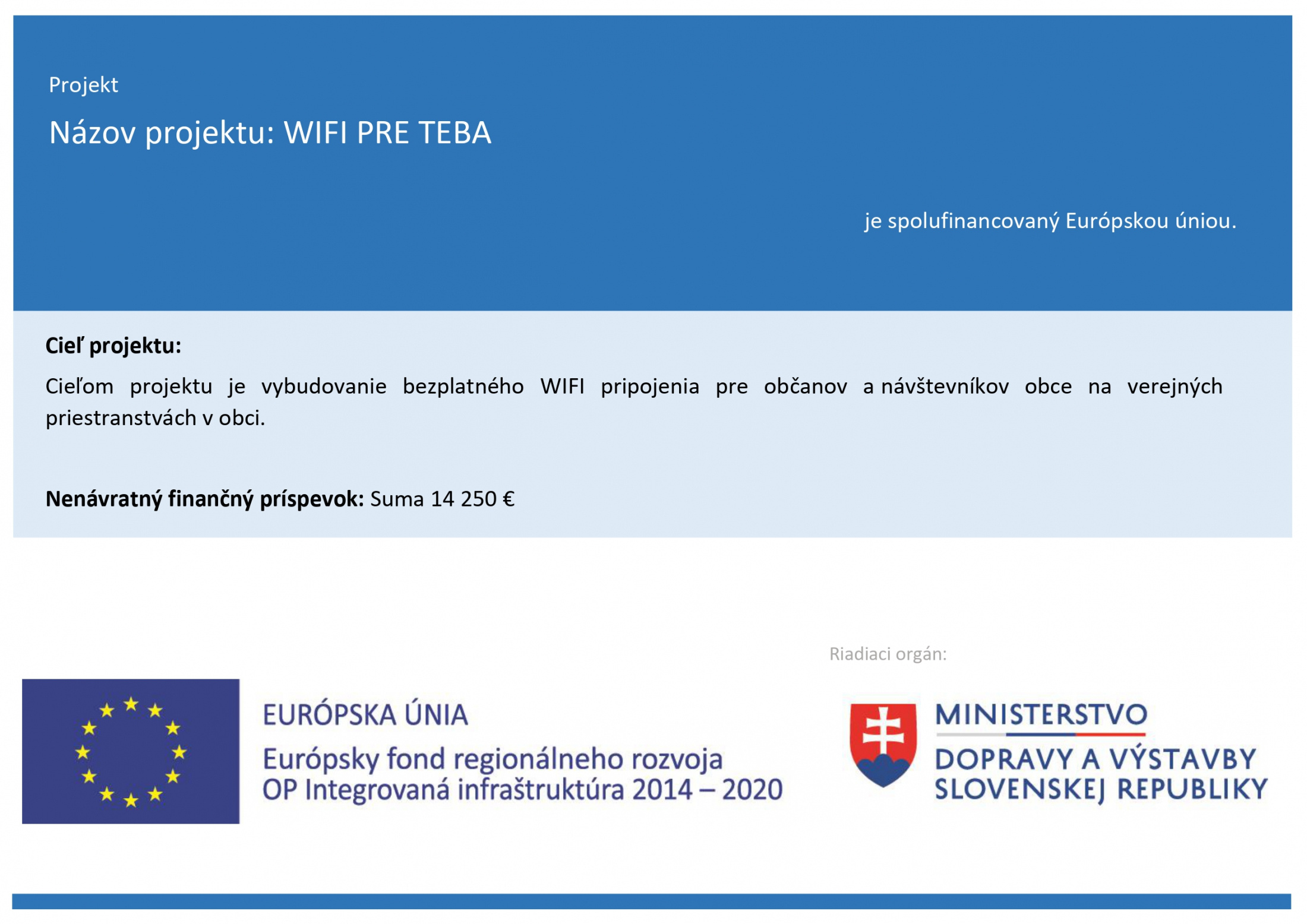 Stručný opis projektu: Realizácia projektu spočíva vo vybudovaní 10 WIFI externých prístupových bodov. Hlavným cieľom projektu je zvýšenie dostupnosti širokopásmového internetu v obci prostredníctvom vybudovania bezplatných WiFi zón. Vybudovanie WiFi prístupových bodov na verejne dostupných priestranstvách poskytne bezplatné pripojenie všetkým občanom a návštevníkom obce k širokopásmovému internetu o minimálnej rýchlosti 30 Mbit/s.